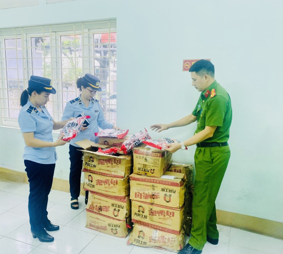 Tiếp đến, ngày 27/9/20213, Đội QLTT số 1 - Cục QLTT tỉnh Lào Cai phối hợp với Công an tỉnh Lào Cai phát hiện, khám lô hàng đóng trong 04 bao tải dứa màu xanh, có dấu hiệu là hàng không rõ nguốn xuất xứ, đang tập kết tại tổ 3, P.Duyên Hải,TP Lào Cai, tỉnh Lào Cai. Kết quả kiểm tra, khám lô hàng gồm 5100 cái cánh vịt ăn liền, đóng gói bao bì bằng nilon loại 01 cái/1gói (đựng trong túi nilon loại 30 gói/túi), chứa trong 04 bao tải dứa màu xanh, trên sản phẩm có in chữ nước ngoài, xuất xứ không thể hiện. Ước tính trị giá lô hàng là 25.500.000 đồng.