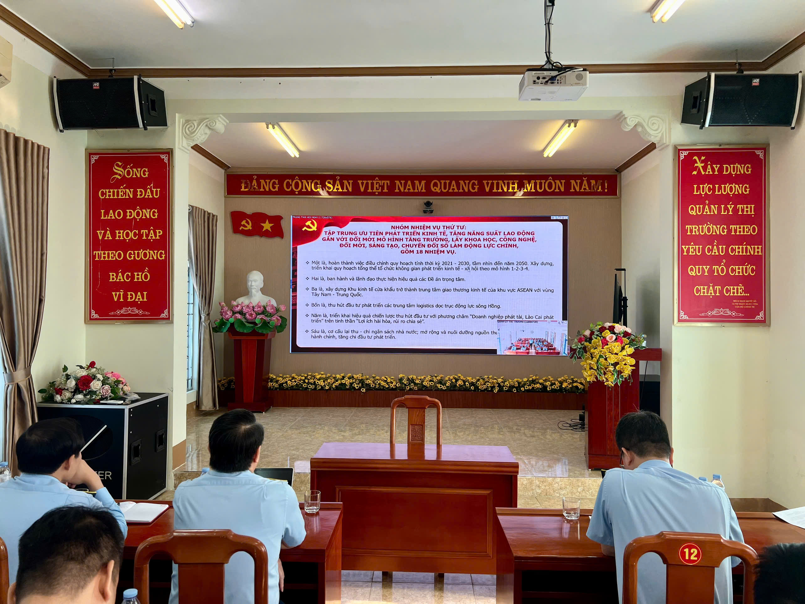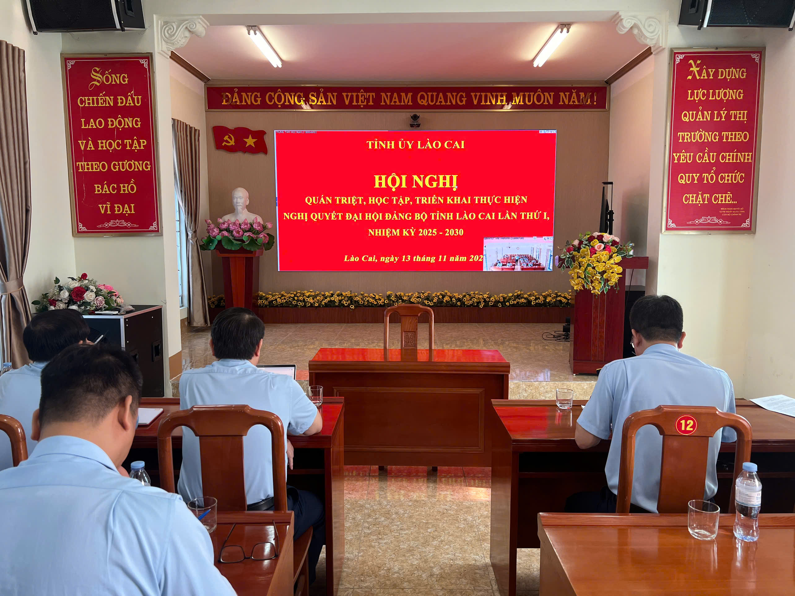 Buổi học được kết nối trực tuyến tại điểm cầu Chi cục Quản lý thị trường trụ sở chính (phường Yên Bái, tỉnh Lào Cai); điểm cầu thuộc Chi cục Quản lý thị trường trụ sở 2 (Khối 7, phường Cam Đường, tỉnh Lào Cai) và điểm cầu các xã, phường tại nơi đặt trụ sở công tác của các Đội Quản lý thị trường với sự tham dự đầy đủ của các đảng viên, công chức, người lao động trong chi bộ, đơn vị. Tại Hội nghị, các đảng viên, công chức, người lao động nghiêm túc lắng nghe các đồng chí báo cáo viên trình bày những nội dung quan trọng, cốt lõi của Nghị quyết Đại hội đại biểu Đảng bộ tỉnh Lào Cai lần thứ I, nhiệm kỳ 2025-2030; Chương trình hành động thực hiện Nghị quyết Đại hội Đảng bộ tỉnh lần thứ I, nhiệm kỳ 2025-2030, nhất là những nhiệm vụ và các giải pháp trọng tâm trong nhiệm kỳ mới.
