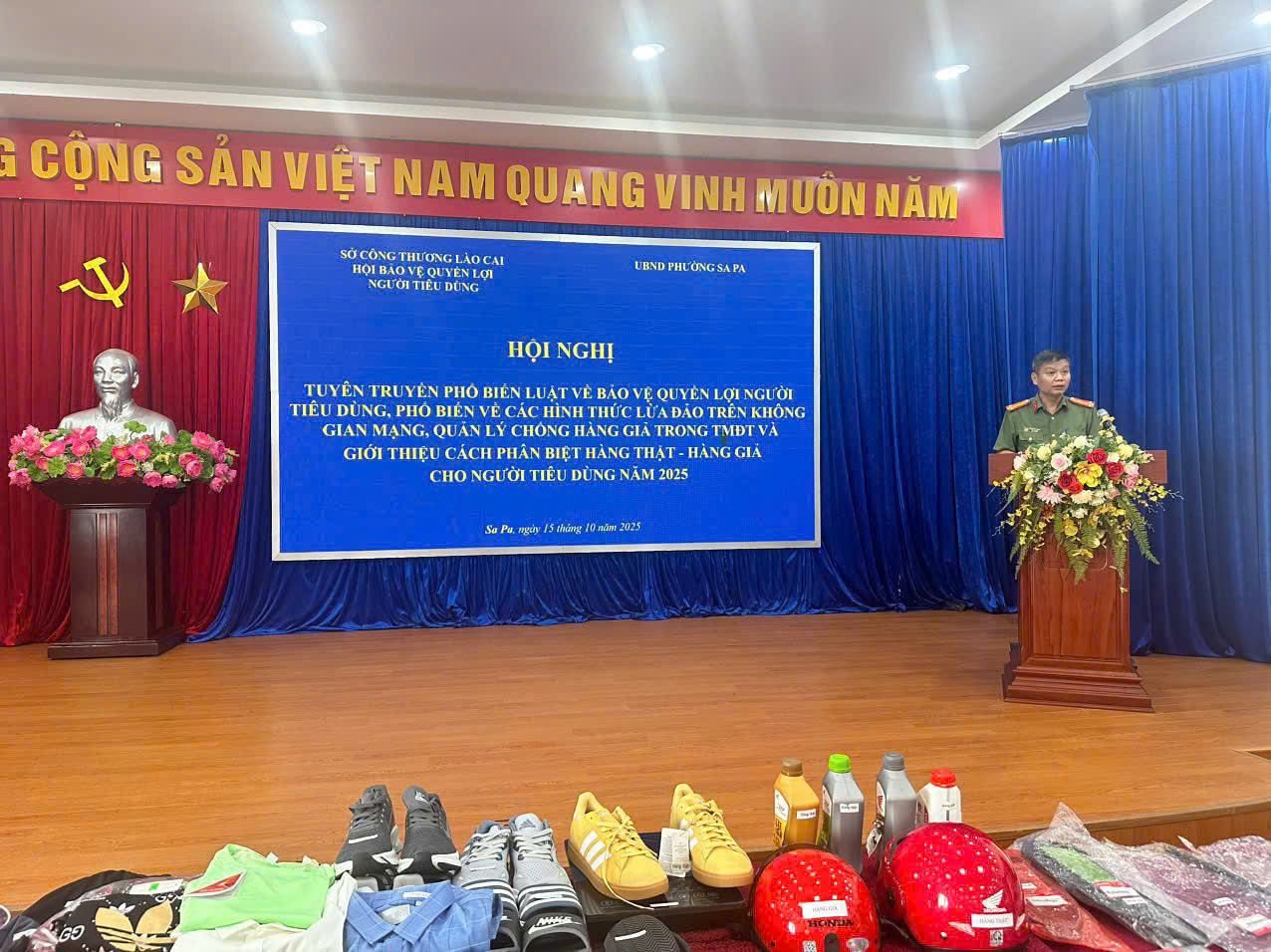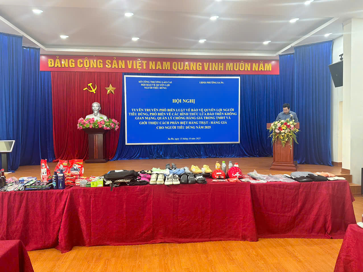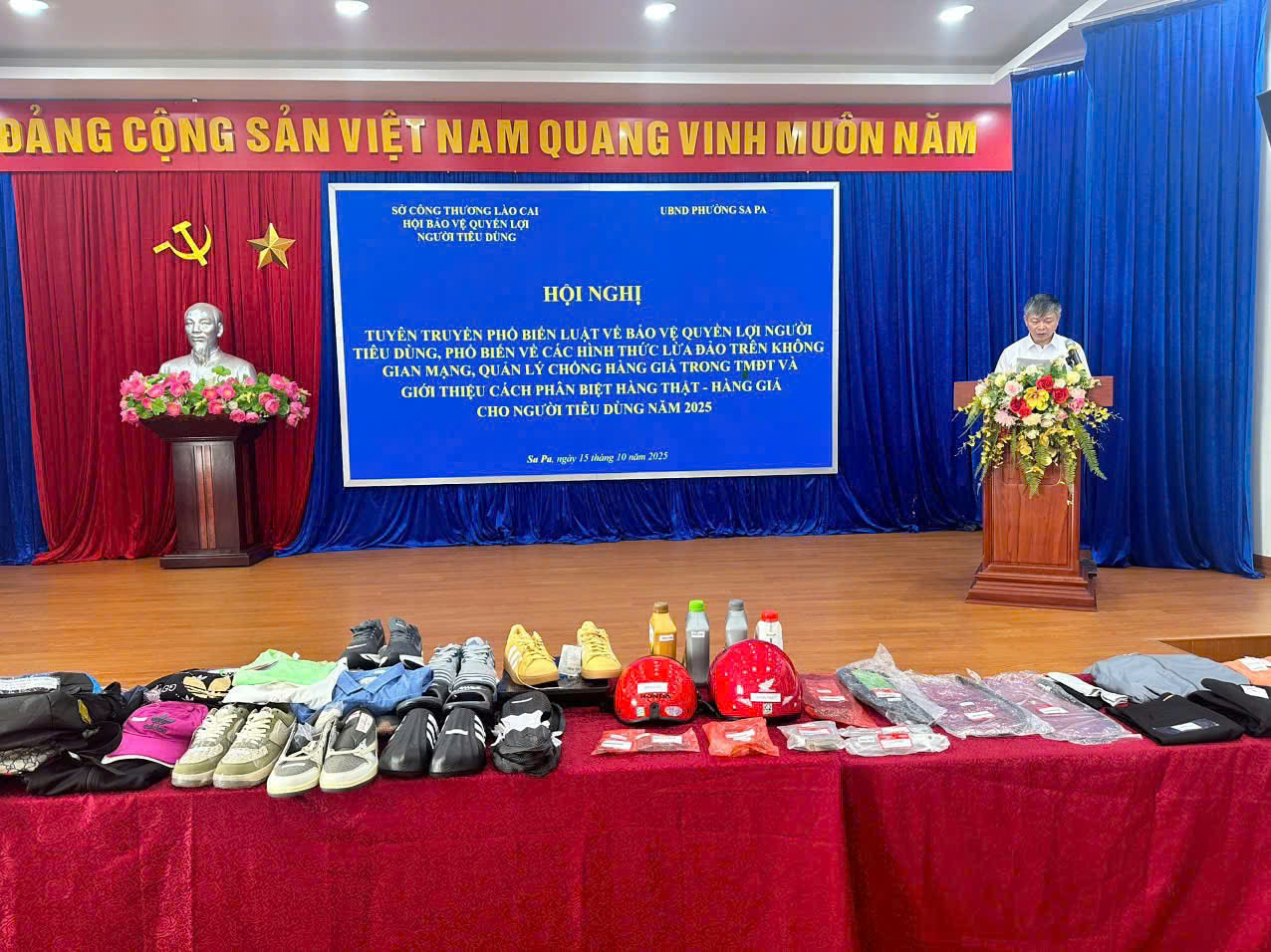 Sáng ngày 15 tháng 10 năm 2025, Sở Công Thương tỉnh Lào Cai chủ trì phối hợp với Ủy ban nhân dân (UBND) phường Sa Pa, Công an tỉnh Lào Cai, Chi cục Quản lý thị trường (QLTT) tỉnh Lào Cai tổ chức Hội nghị tuyên truyền phổ biến pháp luật về bảo vệ quyền lợi người tiêu dùng, phổ biến về các hình thức lừa đạo trên không gian mạng, quản lý chống hàng giả trong thương mại điện tử và giới thiệu cách phân biệt hàng thật hàng giả cho người tiêu dùng. Tham dự và chủ trì Hội nghị có đồng chí Trịnh Văn Thành, Phó giám đốc Sở Công Thương/ Chủ tịch Hội Bảo vệ quyền lợi người tiêu dùng tỉnh Lào Cai; Lãnh đạo UBND phường Sa Pa, Lãnh đạo Chi cục QLTT, lãnh đạo Phòng An ninh mạng và Phòng chống tội phạm Công nghệ cao Công an tỉnh Lào Cai và gần 100 người là giám đốc và chủ hộ kinh doanh trên địa bàn phường Sa Pa, xã Bát Xát tỉnh Lào Cai tham dự.