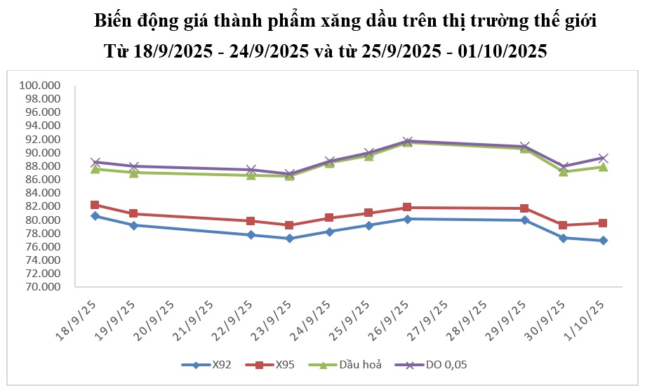 Bình quân giá thành phẩm xăng dầu thế giới giữa kỳ điều hành ngày 25/9 và kỳ điều hành ngày 2/10/2025 là: 78,716 USD/thùng xăng RON92 (dùng để pha chế xăng E5RON92), 80,688 USD/thùng xăng RON95, 89,386 USD/thùng dầu hỏa, 89,968 USD/thùng dầu điêzen 0,05S và 411,796 USD/tấn dầu mazut 180CST 3,5S.