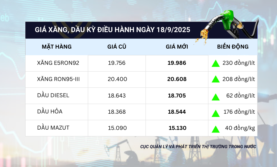 Bình quân giá thành phẩm xăng dầu thế giới giữa kỳ điều hành giá ngày 11/9/2025 và kỳ điều hành ngày 18/9/2025 là: 80,554 USD/thùng xăng RON92 dùng để pha chế xăng E5RON92; 82,676 USD/thùng xăng RON95; 86,712 USD/thùng dầu hỏa; 88,078 USD/thùng dầu điêzen 0,05S; 401,586 USD/tấn dầu mazut 180CST 3,5S .